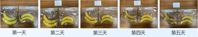 在香蕉保鲜上采用格林春天的量子水性油墨印刷的包装袋包装保鲜,香蕉经过5天之后明显变化,左边没有涂层的香蕉经过五天的放置,从正常的外观颜色,逐渐出现黑斑,腐烂的现象,而右边有格林春天量子水性油墨印刷的涂层,经过五天放置,香蕉外观不明显变化,果皮果肉保持新鲜状态。